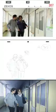 Initially, the director Hiroshi Nagahama declined the offer to direct the anime because he felt it would be best presented as live-action, but reconsidered when he figured out how to adapt it and pitched the idea of using rotoscoping.[13] He felt it was the most appropriate choice because to him, the manga felt very realistic and close to daily life.[14] The live-action filming took around three months to complete on location in Kiryū, Gunma.[4] Along with the editing after, it took about twice the amount of time to produce than a regular anime. The end cards at the end of each episode were animated by Nagahama himself in traditional anime style to differentiate them and he made Oshimi's hair wave around to emulate flash animation.[14]