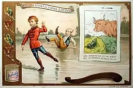 The fable was a favourite in England and was put to popular use on 18th century china by the Fenton pottery[9] and in the 19th century by the Wedgwood pottery. This was on its Aesop series of coloured plates, signed by Emile Lessore in the 1860s.[10] Minton's pottery also used the fable on a series of Aesop tiles a little later. In France a biscuit porcelain figure group illustrating the fable was issued by the Haffreingue porcelain factory at Boulogne between 1857–1859. The ox is modeled lying on the ground and looking down at the frog directly in front.[11]