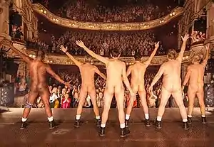 In May 2012, it was announced The Full Monty would receive its world premiere in Sheffield in 2013.[16] The play premiered at the Lyceum Theatre, Sheffield on 2 February 2013, running until 23 February. The production was directed by Daniel Evans,[17] with choreography by Steven Hoggett,[18] design by Robert Jones,[19] lighting by Tim Lutkin[20] and original music and sound design by Max and Ben Ringham.[21] The lead cast for the show included Kenny Doughty as Gaz, Sidney Cole as Horse, Craig Gazey as Lomper, Roger Morlidge as Dave, Kieran O'Brien as Guy and Simon Rouse as Gerald.[22] Following its debut in Sheffield the play embarked on an eleven venue tour[23] visiting Birmingham,[24] Bristol,[25] Canterbury,[26] Aberdeen,[27] Belfast, Edinburgh,[28] Dublin,[29] Salford,[30] Southampton,[31] Southend On Sea[32] and Leeds.[33]