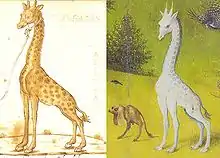 The surrounding landscape is populated by hut-shaped forms, some of which are made from stone, while others are at least partially organic. Behind Eve rabbits, symbolising fecundity, play in the grass, and a dragon tree opposite is thought to represent eternal life.[20] The background reveals several animals that would have been exotic to contemporaneous Europeans, including a giraffe, a monkey riding an elephant, and a lion that has killed and is about to devour his prey. In the foreground, from a large hole in the ground, emerge birds and winged animals, some of which are realistic, some fantastic. Behind a fish, a person clothed in a short-sleeved hooded jacket and with a duck's beak holds an open book as if reading. To the left of the area a cat holds a small lizard-like creature in its jaws. Belting observes that, despite the fact that the creatures in the foreground are fantastical imaginings, many of the animals in the mid and background are drawn from contemporary travel literature, and here Bosch is appealing to "the knowledge of a humanistic and aristocratic readership".[22] Erhard Reuwich's pictures for Bernhard von Breydenbach's 1486 Pilgrimages to the Holy Land were long thought to be the source for both the elephant and the giraffe, though more recent research indicates the mid-15th-century humanist scholar Cyriac of Ancona's travelogues served as Bosch's exposure to these exotic animals.[22]
