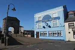 The Gatehouse Pub Monmouth - From the Monnow Bridge. Showing the Riverside Gallery where three houses once stood