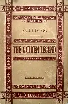 With The Mikado drawing large audiences in London and New York, Sullivan began composing The Golden Legend in Yorktown, Camberley, England, on 24 April 1886, and rehearsals began on 10 September 1886.[12] Like Sullivan's other Leeds Festival pieces, such as The Martyr of Antioch, the work was presented on a grand scale, with 325 voices and 120 orchestra players.[13] In addition to the usual orchestra instruments, Sullivan augmented the woodwind section with piccolos, cor anglais, bass clarinet and contrabassoon, cornets in addition to trumpets, and included prominent parts for bells, harp and organ.[14] The festival was held 13–16 October 1886, and the premiere of The Golden Legend took place on Saturday, 16 October 1886; its success with audiences and critics alike was immediate.[15]