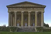 In 1804, Henry Drummond commissioned his friend the architect William Wilkins to transform his brick house into a neoclassical Ancient Greek temple. Wilkins, a promising young architect and antiquary, had been much influenced by his recent travels to Greece and Asia Minor. The massive Doric portico is a copy of the Theseion in Athens and the side elevations imitate the Choragic Monument of Thrasyllus.[8]