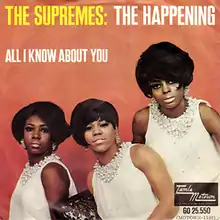 "The Happening" is a 1967 song recorded by Motown artists The Supremes. It served as the theme song of the 1967 Columbia Pictures film The Happening, and was released as a single by Motown at the time of the film's release that spring. While the movie flopped, the song peaked at number 1 on the Billboard Hot 100 pop singles chart in May,[1] becoming The Supremes' tenth number 1 single in the United States,[2] peaking in the top 10 on the UK Singles Chart at number 6, and in the top 5 in the Australian Pop Chart and in the Dutch Pop Chart.