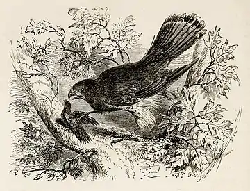 The condemnation of arbitrary power originally implicit in the fable was not entirely lost, however. Illustrations of La Fontaine's more nuanced telling by Carle Vernet[14] and Auguste Delierre (1829-1890)[15] underline the violence of the scene. At the centre of a calm and beautiful landscape, the bird of prey rips up the tiny songbird's breast. The Russian fabulist Ivan Krylov carries that violence over into his adaptation of the story as “The cat and the nightingale”.[16] There the cat captures a nightingale in what it claims is a friendly spirit and begs to hear its famous song. When the bird gives only a shrill cry of distress, the cat devours it, bones and all. Written in 1824, the story satirised the strict literary censorship of the time in Russia.