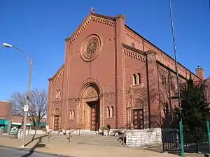 Due to the increasing number of Italian speakers, the parish of St. Ambrose was founded by members of St. Aloysius Gonzaga Parish [2] in what later came to be known as the Hill in 1903 to serve primarily the recent Lombard immigrants. After the first wooden church burned in 1924, a brick church was built in 1926. The structure, designed by architect Angelo Corrubia,[3] was modeled after the Sant'Ambrogio Church in Milan, in a Lombard Romanesque Revival style of brick and terra cotta. Residents took pride in their parish and donated funds for the new church. It became a territorial parish of the Archdiocese of St Louis in 1955, after existing as a personal ethnic parish until that time.
