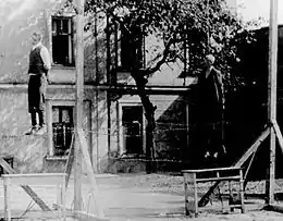On 10 November 1941, capital punishment was extended by Hans Frank to Poles who helped Jews "in any way: by taking them in for a night, giving them a lift in a vehicle of any sort", or "feeding runaway Jews or selling them foodstuffs."[176] The law was publicized with posters distributed in all major cities. Similar regulations were issued by the Germans in other territories they controlled on the Eastern Front.[177] Over 700 Polish Righteous among the Nations received that recognition posthumously, having been murdered by the Germans for aiding or sheltering their Jewish neighbors.[178] Toward the end of the ghetto-liquidation period, some Jews managed to escape to the "Aryan" side,[164] and to survive with the aid of their Polish helpers. During the Nazi occupation, most ethnic Poles were themselves engaged in a desperate struggle to survive. Between 1939 and 1945, from 1.8 million to 2.8 million non-Jewish Poles were murdered by the Nazis, and 150,000 due to Soviet repressions.[179][180] About a fifth of Poland's prewar population perished.[181] Their deaths were the result of deliberate acts of war,[182] mass murder, incarceration in concentration camps, forced labor, malnutrition, disease, kidnappings, and expulsions.[183] At the same time, possibly a million gentile Poles aided their Jewish neighbors.[184] Historian Richard C. Lukas[65] gives an estimate as high as three million Polish helpers; an estimate similar to those cited by other authors.[185][186]