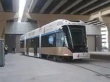 The Hop, also known as the Milwaukee Streetcar, is a modern streetcar system in Milwaukee, Wisconsin. The 2.1-mile (3.4 km)[6][3][7] initial line connects the Milwaukee Intermodal Station and Downtown to the Lower East Side and Historic Third Ward neighborhoods.[8] A 0.4-mile (640 m) Lakefront branch,[6] to the proposed "Couture" high-rise development, has been mostly constructed, but is not projected to open until late 2022. The system is owned by the city and operated by Transdev.