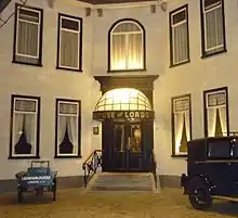 In strange twist of fate, in was the House of Commons that sealed the fate of The House of Lords. The restaurant was one of the victims of the renewal of the parliamentary buildings in The Hague and was demolished in 1986.[5][6] The original frontage is now on display in the Louwman Museum. The director of the museum was a regular visitor of the restaurant and found that the front needed to be preserved for historical reasons. He could justify that because of sign of the Koninklijke Nederlandsche Automobiel Club (Royal Dutch Automobile Club) adjacent to the front door.[7][8]