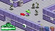 The Incredible Hulk is a free-roaming isometric beat 'em up game in which the player controls the Hulk and guides him through a series of 33 levels.[1] The Hulk can move in eight directions, and his default movement can be toggled between diagonal and horizontal in the options menu. The Hulk can also jump, pick up and throw objects, and use an assortment of physical attacks to destroy enemies and cause damage to the environment.[2] Some levels require the Hulk to locate and destroy generators to deactivate environmental hazards that block a path through the level, and many areas contain hidden paths that can be uncovered by breaking cracked walls.[3]