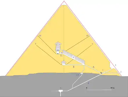 The entrances to all the Fourth Dynasty pyramids at Giza (the Great Pyramid, the Pyramid of Khafre, and the Pyramid of Menkaure) are in their north faces and the corridors are sloped down from the entrances in such a way that both the circumpolar stars and the pole star were visible.[1] The positioning of the pyramids is such that they do not block each other's views of these stars.[1]