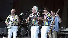 The Beach Boys classic stage look from the early to late 1960s, blue and white striped button-down shirts with either black or grey pants, was taken directly from the Kingston Trio.[126]