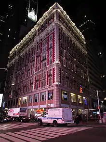 The Knickerbocker Hotel is on the southeastern corner of Broadway and 42nd Street, at the south end of Times Square, in the Midtown Manhattan neighborhood of New York City.[2][3][4] It contains the alternate addresses 1462–1470 Broadway,[2][4][5] 6 Times Square,[5] and 142 West 42nd Street,[6] with a small annex extending south to 143 West 41st Street.[2][4] The building occupies a land lot covering 19,800 square feet (1,840 m2),[3] with frontages of about 135 feet (41 m) on Broadway to the west and about 185 feet (56 m) on 42nd Street to the north.[7][8][9] The frontage on 41st Street is only 17 feet (5.2 m) wide.[9]