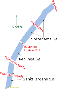 - Peblinge Sø (English: Student Lake). A single basin between Gyldenløvesgade and Dronning Louises Bro (English: Queen Louise's Bridge), which is the continuation of Nørrebrogade. The word pebling means little priest, and was used metaphorically for any student in the elementary and secondary schools in Denmark during the time when the church was the sole provider of education.[4]