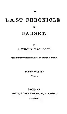 The Last Chronicle of Barset is a novel by English author Anthony Trollope, published in 1867. It is the sixth and final book in the Chronicles of Barsetshire series, preceded by The Small House at Allington. The novel is set in the county of Barsetshire and deploys characters from the earlier novels, whilst concentrating on the personnel associated with the cathedral. The main narrative thread is catalyzed by the loss of a cheque which had been in the possession of the Reverend Josiah Crawley, and the subsequent reactions of his friends and enemies. Trollope drew inspiration from his father and mother in the creation of the Rev. and Mrs. Crawley.[1] In his autobiography, Trollope regards this novel as "the best novel I have written.",[2] though later commentators do not agree with this judgement.[3] The serialization was illustrated by G H Thomas who was selected by the publisher, though Trollope had wished for Millais who had illustrated The Small House.[4]