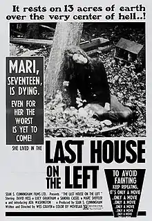 Promotional material capitalized on the film's graphic content and divisive reception, featuring taglines such as "To avoid fainting, keep repeating 'It's only a movie' ..." Under the Last House title, the film proved to be a hit, although anecdotes as to where the advertising campaign originated vary somewhat. Cunningham claims that marketing specialist who devised the Last House title was watching a cut of the film with his wife, who continually covered her eyes, prompting him to tell her that it was "only a movie".[51] Other origins have been suggested, however, as it had been used twice before: first for H.G. Lewis's 1964 splatter film Color Me Blood Red, and then for William Castle's Strait-Jacket the following year.[52] The tagline was so successful that it was re-purposed by many of Hallmark's other releases, such as Don't Look in the Basement and Don't Open the Window,[53] and other exploitation films, sometimes with a unique spin. The film's title was also imitated, as in the cases of Last House on Dead End Street and The House on the Edge of the Park, another film starring David Hess;[54] other films, such as the aforementioned Twitch of the Death Nerve, were later marketed as unofficial sequels with such titles as Last House Part II.[8]