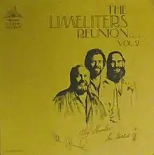The Limeliters Reunion, Vol. 2 is an album released by The Limeliters in 1976 on Brass Dolphin LP record 2202.[2] Recorded live on September 28, 1976 in the Seattle Opera House,[1] the album documents one of the yearly reunion concerts given by the Limeliters in that decade. Vol. 1 contained new material, whereas this album was a tribute to the “folk mania” of the 1960s.[3]