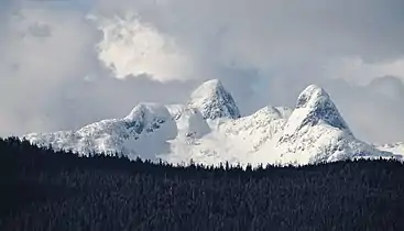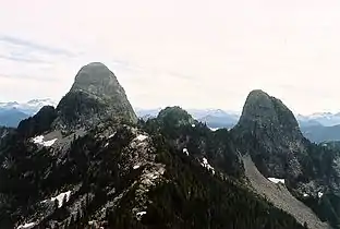 The Lions (Squamish: "Ch'ich'iyúy Elxwíkn" Twin Sisters) are a pair of pointed peaks (West Lion – 1,646 m (5,400 ft);[1] East Lion – 1,606 m (5,269 ft))[2] along the North Shore Mountains in Metro Vancouver, British Columbia, Canada. They can be seen from much of the Greater Vancouver area, as far as Robert Burnaby Park in East Burnaby, south to parts of Surrey, and from the west on the Howe Sound Islands and the Sunshine Coast. Along with the Lions Gate Bridge named in their honour, these twin summits have become one of the most recognizable Vancouver landmarks. The city's BC Lions CFL football team is also named in their honour. Lions Gate Entertainment which was founded in Vancouver in July, 1997 is also named for the peaks.