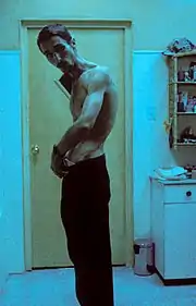 Christian Bale strenuously dieted for over four months prior to filming, as his character needed to look drastically thin. According to a biography of Bale written by his former assistant, this daily diet consisted of "water, an apple and one cup of coffee per day, with the occasional whiskey" (approximately 55–260 calories).[5] According to the DVD commentary, he lost 62 pounds (28 kg), reducing his body weight to 120 pounds (54 kg). Bale wanted to continue down to 99 pounds (45 kg), but the filmmakers would not allow it due to health concerns. In fact, the target weight to which the 6 ft (183 cm) Bale dropped was intended for a much shorter actor, but Bale insisted on seeing if he could make it anyway.[6] At the end of filming he was left with just six weeks to regain enough mass to be ready for the screen test for his role in Batman Begins, which he achieved through weightlifting and binging on pizzas and ice cream.[7]