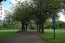 It consists largely of open grassland crossed by tree-lined paths, but also has a children's playground,[2] a croquet club,[3] tennis courts[4] and recreational sport pitches.[5] It is bordered by the University of Edinburgh's George Square campus, the Gordon Aikman Lecture Theatre, the main university library and the Quartermile development on the site of the old Edinburgh Royal Infirmary to the north, Marchmont, Summerhall and Sciennes to the south and Newington to the east.[1] To the south-west it becomes Bruntsfield Links where there is a free, public pitch and putt golf course.[5]