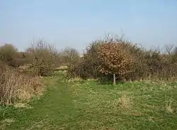 The field has a large area of grassland together with scrub and hedgerows. There are water voles and dormice, while insects include waved black, lunar yellow underwing and water carpet moths and marbled white butterflies.[1]