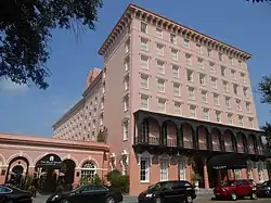 The Mills House Hotel was built by local grain merchant Otis Mills and opened in 1853. The 180-room hotel was designed by architect John E. Earle and cost $200,000.[2] The hotel survived the destruction of much of the city in the Civil War and was later renamed the St. John Hotel at the turn of the twentieth century.[3] When President Theodore Roosevelt visited the South Carolina Inter-State and West Indian Exposition in 1902, he stayed at the hotel.[4] It gradually declined as newer hotels opened, and was finally sold at auction in 1968 to Charleston Associates (Richard H. Jenrette, Charles D. Ravenel, and Charles H. P. Duell).