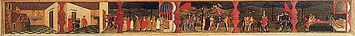 It shows a story of host desecration, possibly inspired by Bernardino of Siena's sermons,[1] running from left to right and with each scene separated from the next by separately-painted half-balustrades. From left to right these show