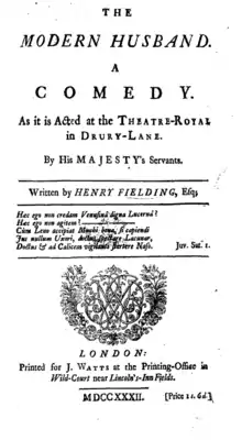 The Modern Husband first ran on 14 February 1732.[1] Fielding put a lot of effort into crafting The Modern Husband and, as he admits in the prologue, sought to come up with something new. He first drafted the play in September 1730 and sent it to Lady Mary Montagu for her opinion.[2] The play was produced on stage for 13 nights, which only The Provoked Husband and Zara ran for as long during that time at Drury Lane. Although early 20th century critics believed that the play could not be popular, it did make money and even put on a benefit show on 2 March 1732. The play was not revived later, possibly because the principal actors of the play died soon after and that the plot of the play discouraged new actors from wanting to play the parts.[3]