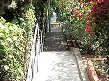 The steps, 133 with multiple landings,[7] which are the focal point of The Music Box, still exist in the Silver Lake district of Los Angeles, near the Laurel and Hardy Park. The steps are a public staircase that connects Vendome Street (at the base of the hill) with Descanso Drive (at the top of the hill),[8] and are located at 923-925 North Vendome Street near the intersection of Del Monte Drive. A plaque commemorating the film was set into one of the lower steps.[9]