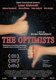 The Optimists (Serbian Cyrillic: Оптимисти) is a 2006 Serbian black comedy film directed by Goran Paskaljević. The film, presented as five unrelated narrative sequences, was inspired by Voltaire's 1759 satirical novel, Candide.[1][2] The Optimists features an ensamble cast of Serbian actors with Lazar Ristovski appearing in all five storylines.