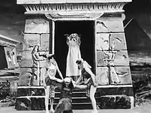 Méliès plays the thief in the film. Though the title refers to the Oracle of Delphi, a high priestess in Ancient Greek religion, the sets and costumes instead indicate an Ancient Egyptian setting. The palanquin and box props, in turn, were later reused for still another setting, the eclectic Orientalism of Méliès's film The Palace of the Arabian Nights (1905).[3] The special effects techniques in the film include substitution splices as well as dissolving multiple exposures.[3]