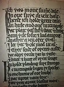 This manuscript, given to Jesus College between 1684 and 1697 by rector Thomas Wilkins, contains 33 texts in English, Anglo Norman, and Latin. All of the script is in one hand and written in a plain, amateurish style.[3] The Owl and Nightingale is written in two columns with some capital letters in blue and red but no illumination.