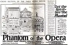 The Phantom of the Opera is a 1925 American silent horror film adaptation of Gaston Leroux's 1910 novel Le Fantôme de l'Opéra, directed by Rupert Julian and starring Lon Chaney in the title role of the deformed Phantom who haunts the Paris Opera House,[1] causing murder and mayhem in an attempt to make the woman he loves a star. The film remains most famous for Chaney's ghastly, self-devised make-up, which was kept a studio secret until the film's premiere. The film was released on November 15, 1925.[2]