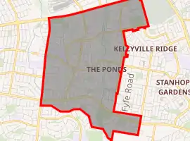 "The Ponds" was a name designed to reflect the geography of the area and was derived from the nearby creek called "Second Ponds Creek", and the growing population. The Ponds was officially designated as a separate suburb in January 2007.[4] The Ponds had previously been part of the suburbs of Kellyville and Kellyville Ridge.