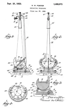 He presented the application of patent on 25 January 1922 and was conceded the same on 25 September 1923 under number US1468973.[7] However, the final model differed of the aforementioned patent in the zone of the base, since there were later modifications of design that were collected in a new patent for a refracting telescope version. Although it presented the application some months after the first, 7 September 1922, it was conceded years later, on 6 December 1927 under number US1651412 but it was never manufactured.[4]