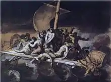 The Raft of the Medusa (French: Le Radeau de la Méduse [lə ʁado d(ə) la medyz]) – originally titled Scène de Naufrage (Shipwreck Scene) – is an oil painting of 1818–19 by the French Romantic painter and lithographer Théodore Géricault (1791–1824).[1] Completed when the artist was 27, the work has become an icon of French Romanticism. At 491 by 716 cm (16 ft 1 in by 23 ft 6 in),[2] it is an over-life-size painting that depicts a moment from the aftermath of the wreck of the French naval frigate Méduse, which ran aground off the coast of today's Mauritania on 2 July 1816. On 5 July 1816, at least 147 people were set adrift on a hurriedly constructed raft; all but 15 died in the 13 days before their rescue, and those who survived endured starvation and dehydration and practiced cannibalism (the custom of the sea). The event became an international scandal, in part because its cause was widely attributed to the incompetence of the French captain.