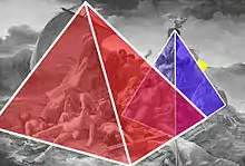 The viewer's attention is first drawn to the centre of the canvas, then follows the directional flow of the survivors' bodies, viewed from behind and straining to the right.[22] According to the art historian Justin Wintle, "a single horizontal diagonal rhythm [leads] us from the dead at the bottom left, to the living at the apex."[26] Two other diagonal lines are used to heighten the dramatic tension. One follows the mast and its rigging and leads the viewer's eye towards an approaching wave that threatens to engulf the raft, while the second, composed of reaching figures, leads to the distant silhouette of the Argus, the ship that eventually rescued the survivors.[3]