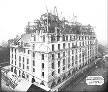 Excavation for the hotel began by contractors Waring White Building Co. Ltd in June 1904, and it was completed by 1 October 1905, and opened the following May.[93] The building progress was documented each month by The Builder's Journal and Architectural Engineer, and in one edition noted the difficulties of some of the aspects of construction such as hoisting 20-ton 39 feet (12 m) steel joists in a narrow building site. The Architect and Contract Reporter noted that the limited space did not allow for the storage of materials on site. All mortar had to be mixed in the basement and the stone was dressed "on a platform with a watertight roof over the footway".[94] The red-brick foundations of the earlier Walsingham House had to be blasted away to facilitate the foundations of the steel structure in concrete.[95][lower-alpha 13]
