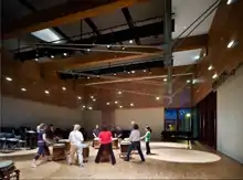 "A granite cube which floats above Bloor Street,"[53] this multipurpose performance and event space is located on level 2 of the TELUS Centre for Performance and Learning. It has space for up to 150 seats and is designed to accommodate a range of functions, including special events, performance, rehearsals, and "Learning Through the Arts™" activities.[54] In scale and proportion, the Conservatory Theatre replicates the acoustic quality and stage size of Koerner Hall to prepare students for live performance. The venue is named in honour of James and Louise Temerty.[55]