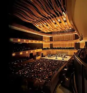 Named for donors Michael and Sonja Koerner, Koerner Hall opened in September 2009 and houses 1,135 seats. It was designed by KPMB Architects, under the direction of Marianne McKenna, theatre consultant Anne Minors Performance Consultants, and acoustics company Sound Space Design. It features two balcony tiers above the main orchestra level as well as a third technical balcony.[47] Koerner Hall's signature element is an acoustically transparent veil of twisting oak strings that forms the backdrop for the chorus at the first balcony level, then hovers over the stage below the fixed acoustic canopy, extending into and over the hall at the technical balcony level.[48] Completion of the project also includes three tiers of glass fronted lobbies overlooking Philosopher's Walk, back-of-house areas for performers, a ground-floor café, and installation of a unique collection of antique musical instruments donated by the Koerner family and valued at $1 million.[49] Each level is also equipped to host a variety of private functions.