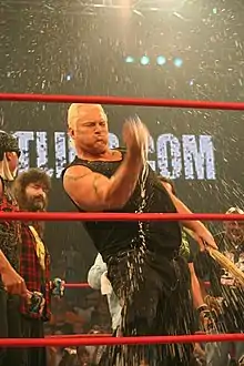 Sandman returned to TNA on July 27, 2010, at the tapings of the August 5 edition of TNA Impact!, in order to take part in the August 8 ECW reunion show, Hardcore Justice.[14] At the event on August 8, Sandman assaulted former rival P.J. Polaco (Justin Credible) after his match with Stevie Richards.[15] On the following edition of Impact!, the ECW alumni, known collectively as EV 2.0, were assaulted by A.J. Styles, Kazarian, Robert Roode, James Storm, Douglas Williams and Matt Morgan of Ric Flair's Fourtune stable, who thought they didn't deserve to be in TNA.[16][17] The following week TNA president Dixie Carter gave each member of EV 2.0 TNA contracts in order for them to settle their score with Fourtune.[18] Sandman no-showed an Impact! taping on August 23 and has made no more appearances for the company since.[19]