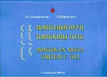 Mongɣol‑un niɣuca tobciyan; Traditional Mongolian: ᠮᠣᠩᠭᠣᠯ ᠤᠨᠨᠢᠭᠤᠴᠠᠲᠣᠪᠴᠢᠶᠠ, Khalkha Mongolian: Монголын нууц товчоо, Mongolyn nuuts tovchoo [note 1]; Chinese: 《蒙古秘史》; pinyin: Měnggǔ Mìshǐ; lit. 'Mongol Secret History') is the oldest surviving literary work in the Mongolian language. It was written for the Mongol royal family some time after the 1227 death of Genghis Khan (born Temujin). The author is anonymous and probably originally wrote in the Mongolian script, but the surviving texts all derive from transcriptions or translations into Chinese characters that date from the end of the 14th century and were compiled by the Ming dynasty under the title The Secret History of the Yuan Dynasty (Chinese: 《元朝秘史》; pinyin: Yuáncháo Mìshǐ). Also known as Tobchiyan (Chinese: 脫必赤顏; pinyin: Tuōbìchìyán or 脫卜赤顏; Tuōbǔchìyán) in the History of Yuan.