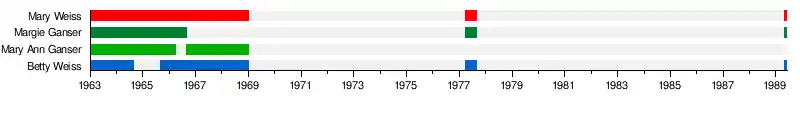 The group was formed at Andrew Jackson High School in Cambria Heights, a neighborhood in Queens, New York City, in 1963. They were two pairs of sisters: Mary Weiss (lead singer) (born December 28, 1948) and Elizabeth "Betty" Weiss (born November 27, 1946), and identical twins Marguerite "Marge"/"Margie" Ganser (February 4, 1948 July 28, 1996)[1] and Mary Ann Ganser (February 4, 1948 March 14, 1970).[2][3][4]