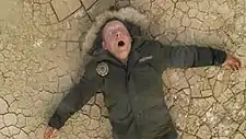 The episode's flashforwards commence with Ben waking up alarmed in the Sahara with a wounded right arm and vapor rising from him. The Dharma Initiative parka that he wears was codenamed "Dharka" by the writers.[28] A couple of Easter eggs are present in this scene:[29] Ben's parka has a name tag that indicates that it was formerly owned by Edgar Halliwax (François Chau) and it displays the first appearance of the logo for a Dharma station called the "Orchid" that would not be seen until the episode titled "There's No Place Like Home".[30] Another Easter egg is glimpsed in the next scene, when Ben reveals his forged Canadian passport previously seen in "The Economist" for his alias Dean Moriarty,[31] which is also the name of the central character in Jack Kerouac's 1951 novel On the Road.[32] Among the most frequent questions that the writers are asked is whether they have planned out future storylines,[33] so the writers try to allude to future plot points, such as with the Dharka scene, that they can later call on as proof that they do know where the story is headed.[21] Director Jack Bender described the scene, which was filmed in a Hawaiian rock quarry, as especially hard to shoot because the actors had to ride horses and use guns, the crew had to relocate due to rocks present that were unsuitable for the scene, and Bender walked head-first into a crane.[34] Emerson stated that the set is "definitely a no-glamour zone ... I thought we would ease into things. Instead, I get this all-Ben extravaganza: combat, riding horses, foreign languages. And piano playing! All waaaay outside my comfort zone. How can you work two weeks and feel like you need a vacation already?"[35]