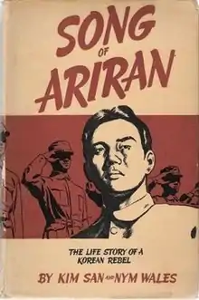Song of Ariran (New York: John Day 1941) is a book of reportage by an American journalist, Helen Foster Snow under the name Nym Wales. Snow traveled to Yan'an, the wartime capital of the Chinese Communist Party, which welcomed and supported many Koreans in the fight for independence from Japan. The colorful and personal information on the history of the Korean independence movement and the Chinese Communist movement in the 1930s is based on extensive interviews with a Korean communist Jang Jirak (Korean 장지락) who is called Kim San (Korean 김산) in the book.[1]