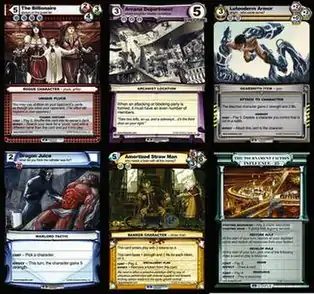 Playable cards come in several types, not counting Staples: Characters, Items, Tactics, and Locations. Each of these types often have subtypes. To win the game, the opponent's Faction must be reduced to 0 influence. The Tournament Faction starts with 25 influence. The Faction's influence may be reduced by attacking it with Characters, or by using Tactics or special abilities. Characters have three stats: Strength (amount of damage the Character deals), Life (amount of damage needed to destroy the Character), and Speed (faster Characters deal their damage earlier).[3] The combat system is simple in design, but with the ability to have multiple attacks during a turn, the party system and speed mechanic, the game allows for a deep and rewarding strategic decision tree that is "easy to lean, but difficult to master".