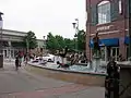 The Main Street feel continues to the outdoor portion of the mall, as well. The statues continue outside and are even incorporated into fountains in and outside of the mall. A 70-foot smokestack can be found at the end of the outdoor stretch of the mall in an effort to pay homage to the heritage of downtown Durham. Mature trees and shrubbery were shipped in from other locations in order to make the mall seem as if it has been in Durham for a long time. The outdoor Main Street includes larger retailers and stand-alone restaurants such as The Cheesecake Factory.[10]