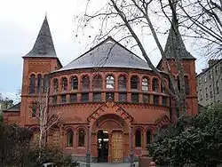The Tabernacle is a Grade II-listed building in Powis Square, Notting Hill, west London, England, built in 1887 as a church. The building boasts a curved Romanesque façade of red brick and terracotta, and towers with broach spires on either side. Today the Tabernacle serves as a cultural arts and entertainment venue, including a theatre, meeting rooms, music studio, art gallery, bar and kitchen, conservatory and a garden courtyard.
