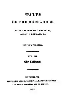 The first edition of The Talisman was published as part of Tales of the Crusaders in Edinburgh by Archibald Constable and Co. on 22 June 1825. It was advertised for publication by Hurst, Robinson, and Co. in London on the same date, but apparently not issued until 11 July. The price was two guineas (£2 2s or £2.10).[3] As with all of the Waverley novels until 1827 publication was anonymous. There is no conclusive evidence that Scott returned to the novel until the spring of 1831 when he revised the text and provided an introduction and notes for the 'Magnum' edition, in which it appeared as Volume 38 in July 1832.[4]