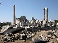 What sensations of melancholy and sadness did not sometimes seize the traveling admirers of antiquity when, in the formerly beautifully built lands of Greece, they found sleeping places for shepherds and wild animals' caves amidst the remains of temples! [Richard] Chandler describes such a fierce appearance when he saw the ruins of the [Hellenistic] Temple of Apollo at Ura, not far from Miletus.[17] The columns were so extraordinarily beautiful, the marble mass so large and noble that it is perhaps impossible to imagine more beautiful or majestic ruins [...] The whole mass was illuminated by the setting sun with a variety of rich inks, and cast a very strong shadow. The distant sea was flat and shiny, and bordered by a mountainous coast with rocky islands.[18]